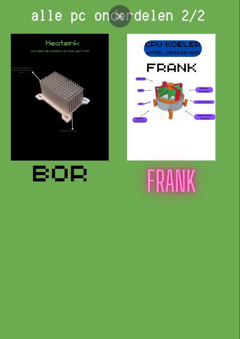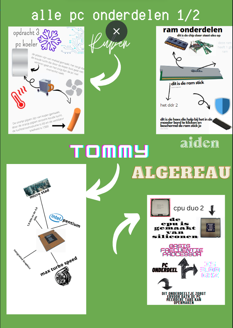 De eerste opdracht van de bovenbouw. Voor deze opdracht moesten we onderdelen van een PC uitkiezen en die onderzoeken. We moesten de fuctie opzoeken, de werking en het model. Na afloop moesten we er ook een 3D model van maken in tinkercad. Al dit moesten we bij elkaar verzamelen en op een poster zetten.